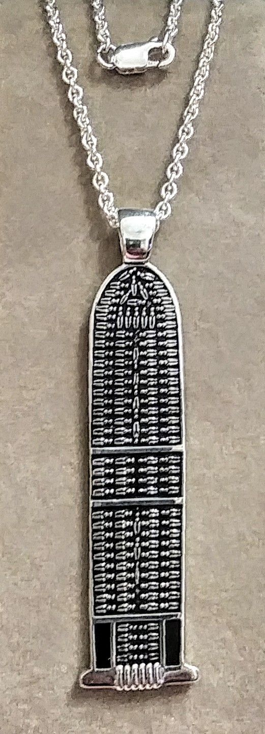 Designed by VERASH. Cartouche is cast in sterling silver, [optional yellow gold (14), or white gold (14)] then hand finished with an antique background plus a 20″ long sterling silver heavy duty round cable chain with a lobster clasp closing.